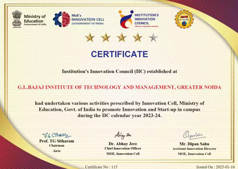 GL Bajaj Institute of Technology & Management (GLBITM) proudly announces its 4-Star rating from the Institution's Innovation Council (IIC), Ministry of Education, Government of India, in the 2023 ratings. This marks the third consecutive year of achieving the highest rating, showcasing GLBITM's unwavering commitment to innovation and development.