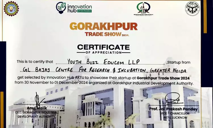 GL Bajaj Center for Research and Incubation participated in the Gorakhpur Trade Show, GIDA, where two incubated startups—Dream Provider Pvt. Ltd. and Youthbuzz Educom LLP—presented their innovative ventures with support from Innovation Hub, Lucknow and StartinUP Team.
